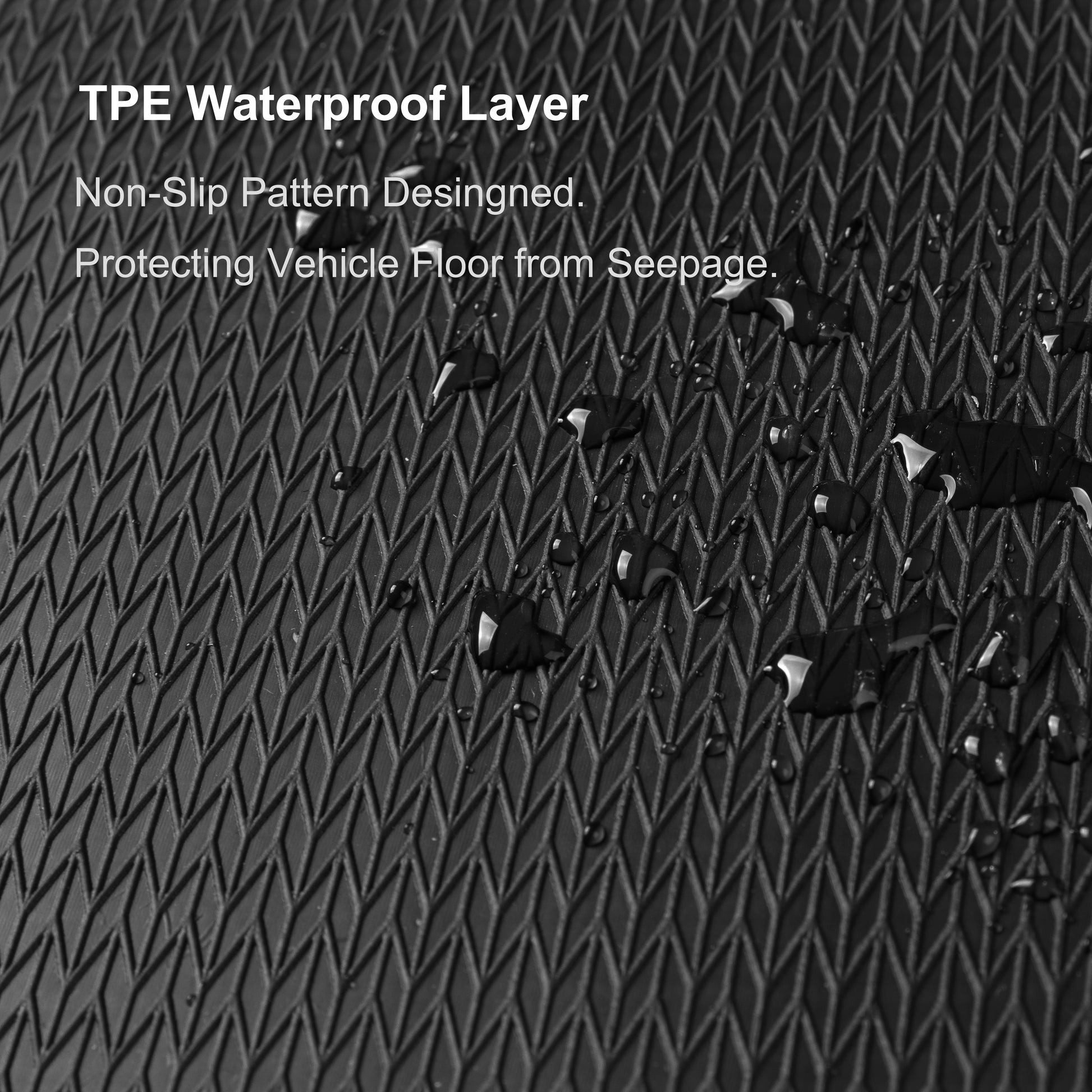 There is a waterproof layer between the carpet and the “Friction Claws” Backing. The waterproof layer is made of TPE. Allowing it can be flame retardant and waterproof, keep your vehicle’s floor clean and pristine in all seasons.